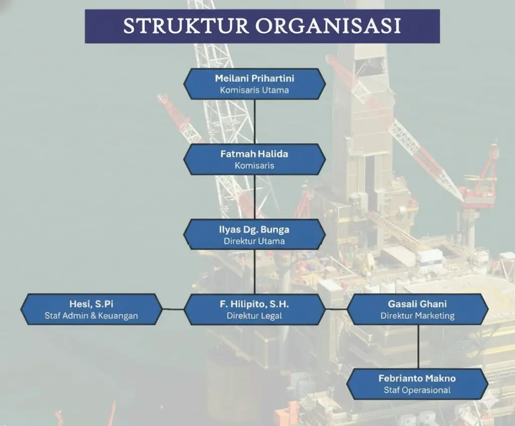 Struktur Organisasi KomisarisMeilani Prihartini — Komisaris UtamaFatmah Halida — KomisarisDireksiIlyas Dg. Bunga — Direktur UtamaGasali Ghani — Direktur MarketingF. Hilipito, S.H. — Direktur LegalStafHesi, S.Pi — Staf Admin & KeuanganFebrianto Makno — Staf Operasional Integritas dan dedikasi menjadi komitmen kami dalam memberikan pelayanan terbaik kepada setiap pelanggan. Kontak
